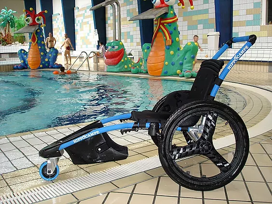 Το αμαξίδιο πισίνας Hippocampe είναι ένα καροτσάκι κατασκευασμένο από ανοξείδωτα υλικά και σχεδιασμένο να αντέχει στο νερό. Μπορεί να χρησιμοποιηθεί στα αποδυτήρια, στο ντους, στις τουαλέτες και στο ποδόλουτρο. Το αμαξίδιοσυνοδεύει τον χρήστη στον υδάτινο χώρο. Το αμαξίδιο πισίνας διευκολύνει την πρόσβαση των ατόμων στις πισίνες και σε προσαρμοσμένες σωματικές δραστηριότητες όπως η κολύμβηση για άτομα με δυσκολίες κίνησης.
