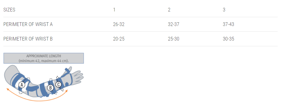 Elbow Orthosis 94300 from the Spanish company Orliman. Made up of an arm valve and a forearm valve joint together via a mono-centrical articulation with the possibility of adjustment of the flexo-tension through 00 to 900 in intervals of 300.