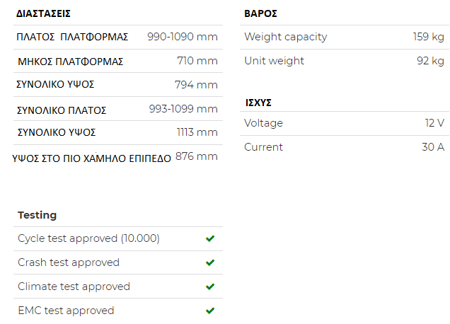 - Ανυψώνει με ασφάλεια συσκευές κινητικότητας βάρους έως 159 κιλών στο όχημά σας.